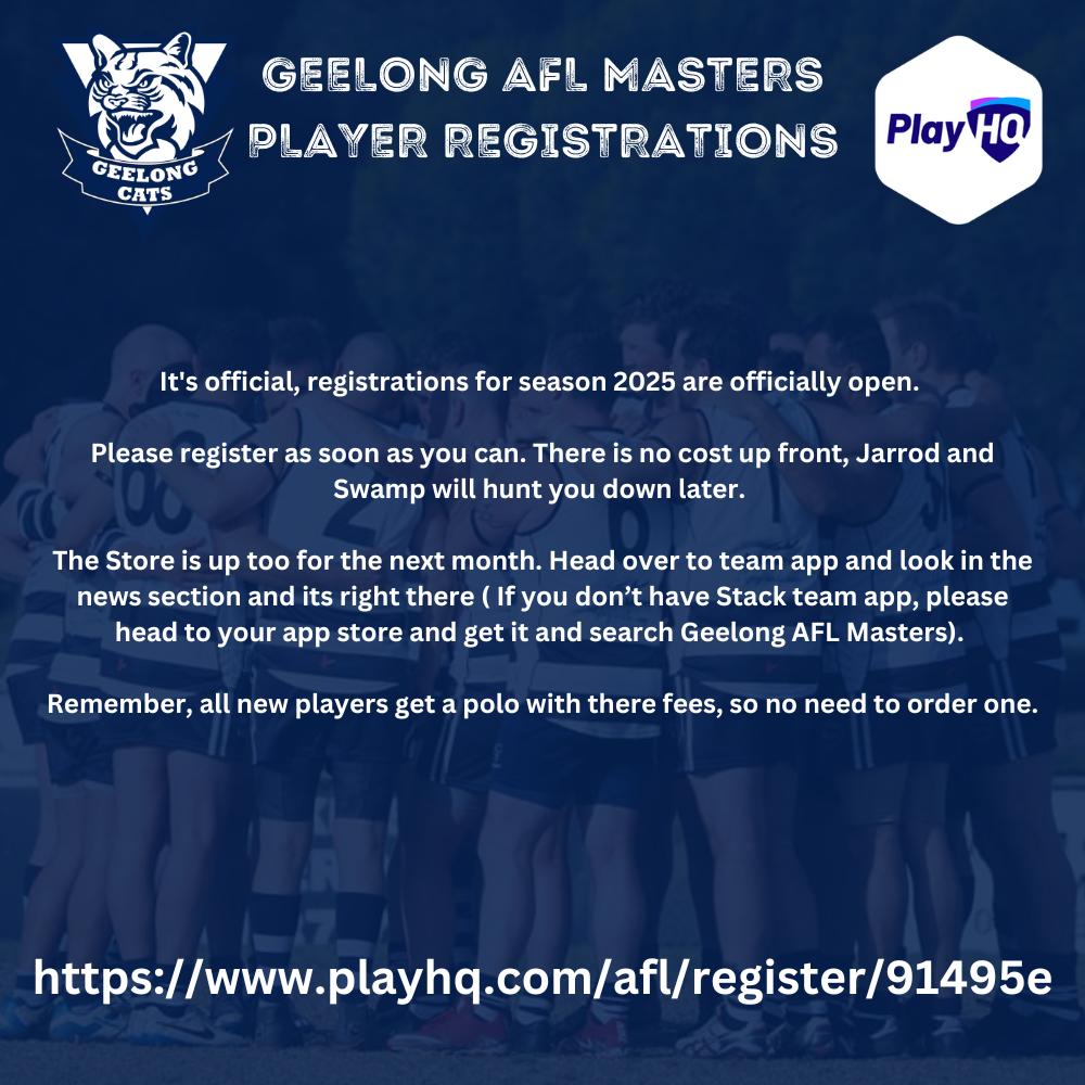 The Store is up too for the next month. Head over to team app and look in the news section and its right there ( If you don’t have Stack team app, please head to your app store and get it and search Geelong AFL Masters).